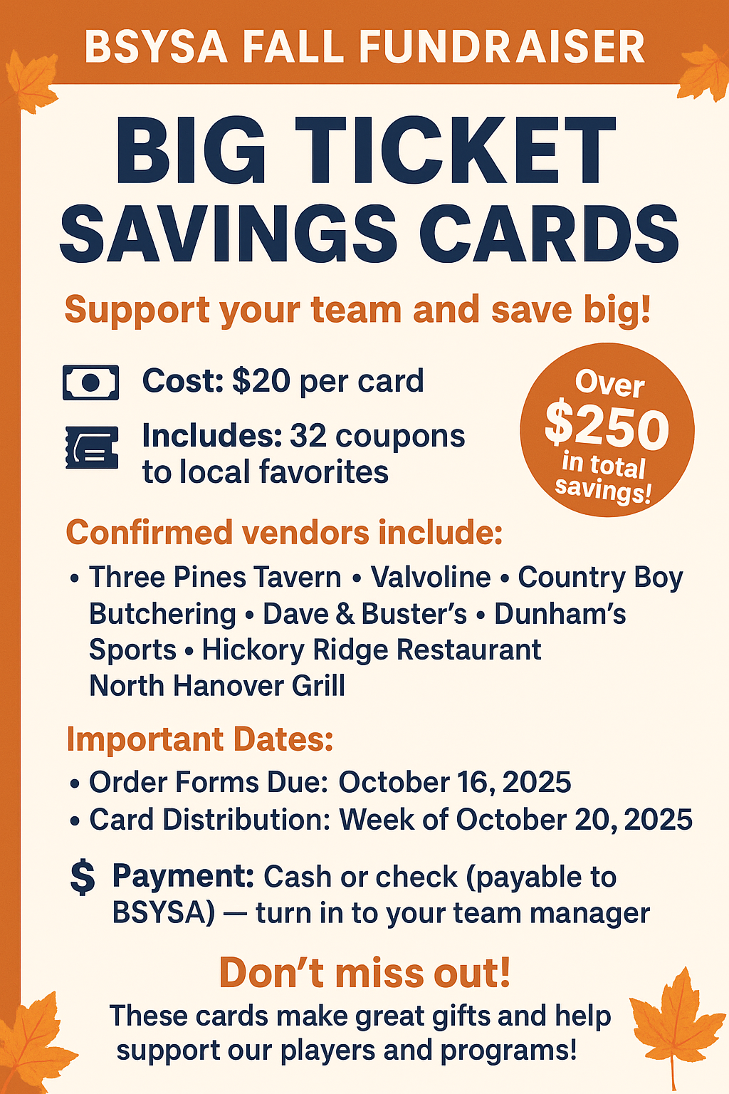 Cash or check (payable to BSYSA) — turn in to your team manager